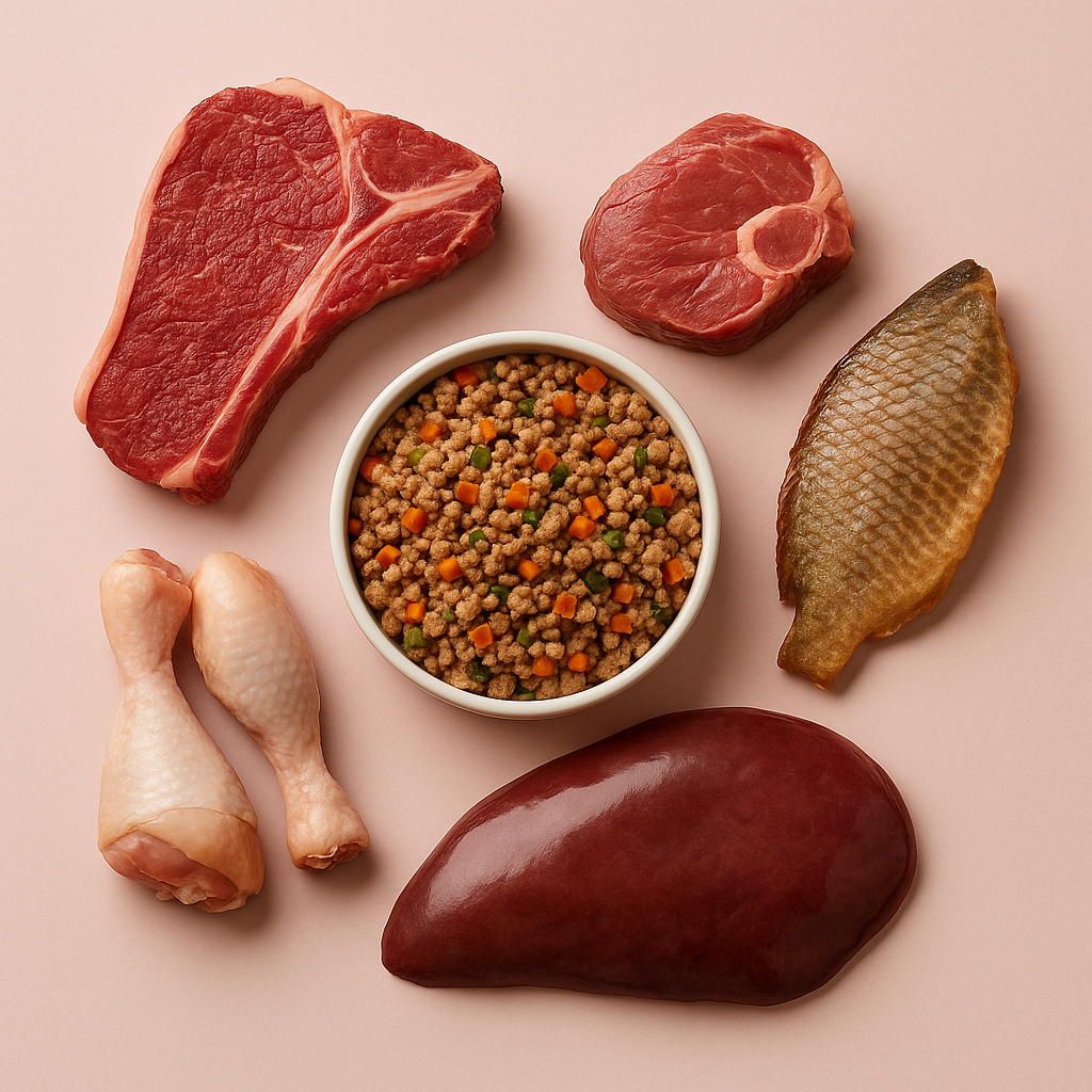 Ingredientes: Subproductos de pollo, hígado de pollo, zanahoria, acelga, carne molida de cerdo, remolacha, pared celular de levadura (fuente de MOS y betaglucanos), probióticos (Lactobacillus spp., Bifidobacterium spp., Enterococcus faecium, Bacillus subtilis, Sacharomyces cerevisiae), aceite de pescado (fuente de EPA y DHA), sal (este producto contiene huesos carnosos).